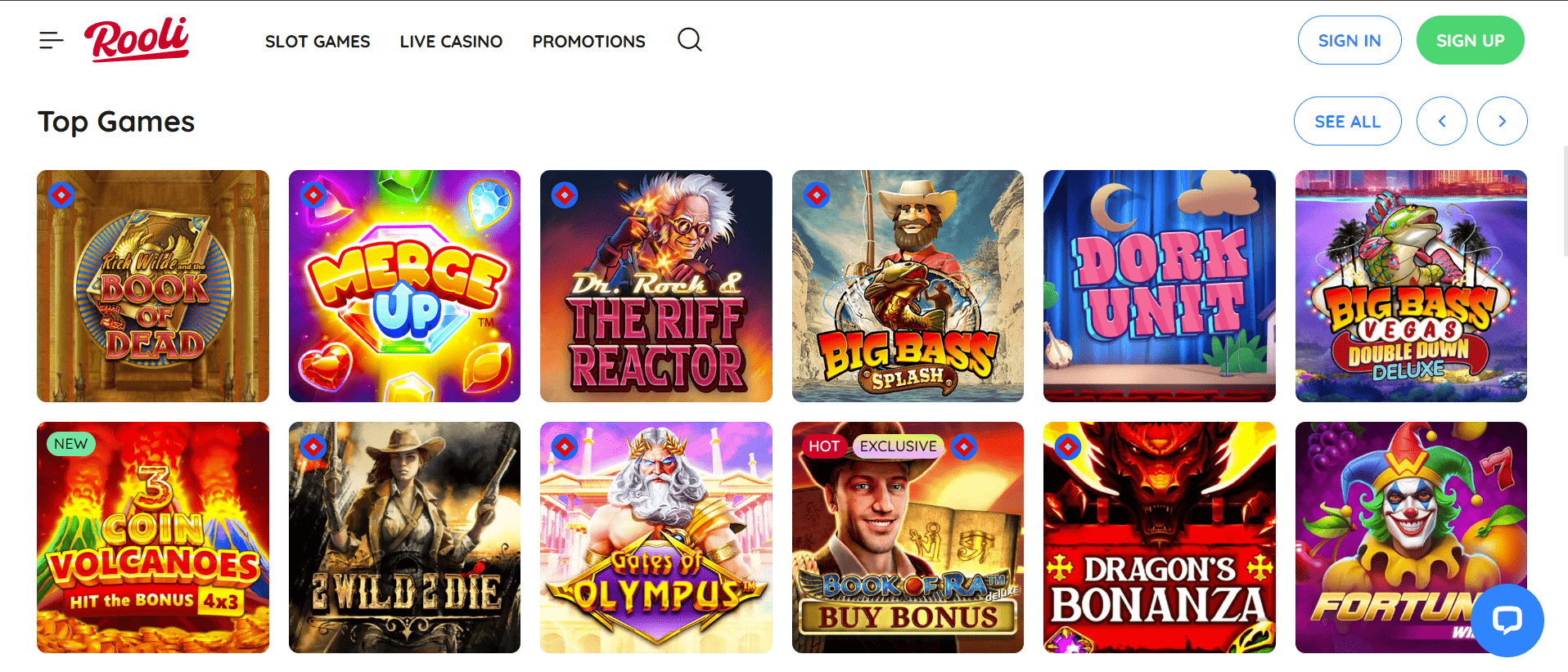 Rooli bietet eine vielfältige Auswahl an Spielautomaten, Tischspielen, Live-Casino-Spielen und Rubbellosen.